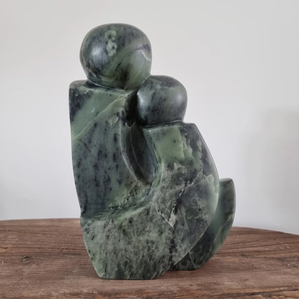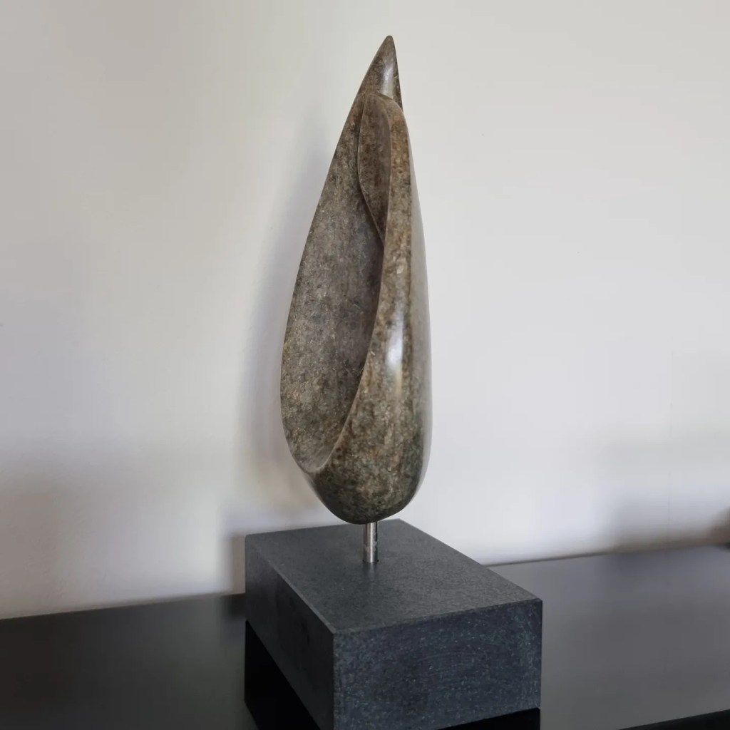 Fulltime beeldhouwen doe ik nu ongeveer 3 jaar. Het is mijn werk. Ik maak graag beelden in opdracht maar ook vrij werk. Ik merk dat ik nog een beetje op zoek ben naar mijn handtekening. Waar kun je mijn beelden aan herkennen? Van welk beeld kan gezegd worden, ja, dat is typisch een beeld van Carolien. Al gaande merk ik dat ik het leuk vind om diversiteit in mijn beelden te hebben. Een variatie tussen abstract en realistisch. Ik wil graag elke keer weer wat anders ontdekken en maken. Ook verschillende steensoorten proberen. Van speksteen en albast, de zachtere stenen naar de hardere stenen zoals serpentijn, galastone en binnenkort ook kalksteen en marmer. 1 thema springt er bij mijn beelden wel uit, de mens. Graag maak ik beelden die een bepaalde emotie of gevoel oproept of waar je de emotie in kan zien. En wie er ook naar het beeld kijkt, de reacties zullen altijd verschillend zijn. De betekenis van beeldende kunst is altijd de betekenis die je er zelf aan geeft. En dit beeld? Zeg t maar…